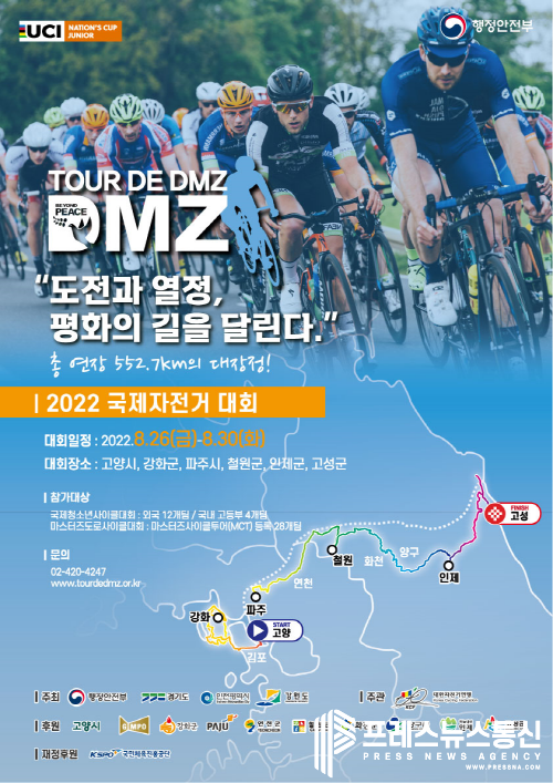 [프레스뉴스] 김대일 기자= 행정안전부와 경기도, 인천광역시, 강원도가 공동주최하고 대한자전거연맹이 주관하는 ‘뚜르 드 디엠지(Tour de DMZ) 2022 국제자전거대회’가 3년 만에 개최된다.