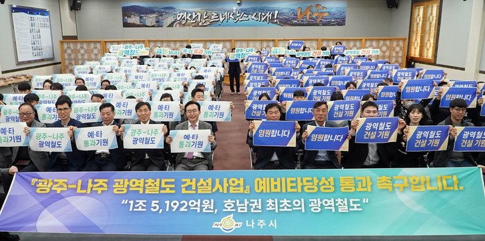 [전남=프레스뉴스] 강래성 기자= 전라남도 나주시가 광주-나주 광역철도사업 예비타당성 조사 통과를 바라는 지역민들의 염원을 하나로 모아 결의를 다지고 있다.
