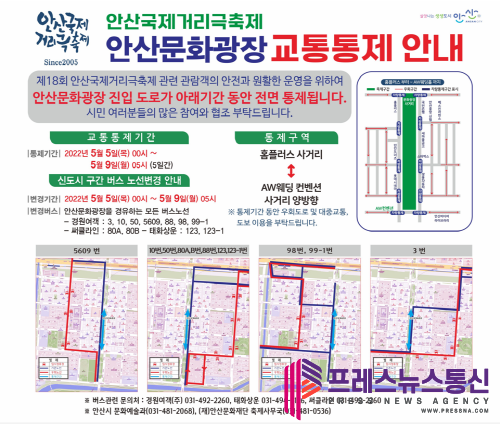 또 국제거리극축제 개최에 따라 5일 오전 0시부터 9일 오전 5시까지 안산문화광장 홈플러스 사거리부터 AW웨딩 컨벤션 사거리 양방향 진입 도로는 통제되며, 이 구간을 지나는 일부 버스노선도 우회 운행한다.
