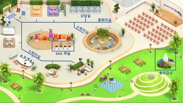 메타버스 공간 입구에는 사용 가이드와 헬프센터가 있어 초보 사용자도 쉽게 사용할 수 있도록 만들었으며, 로비 중앙과 사이드에는 순천시 유튜브, 인스타, 블로그 등의 사회관계망서비스(SNS) 채널과 음악감상도 할 수 있는 힐링존을 구축했다.