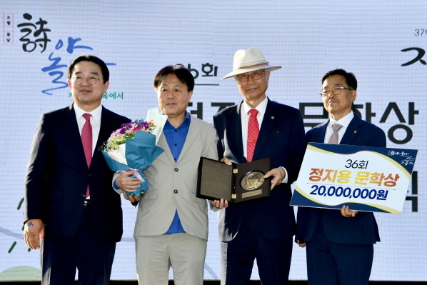 | ▲제36회 정지용문학상(왼쪽부터 황규철 옥천군수, 이재무 시인, 유자효 지용회 회장)사진=옥천군 |