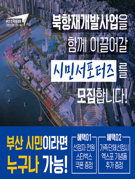 범시민추진협의회는 부산시민 누구나 참여할 수 있다. 오는 9월 10일부터 10월 7일까지 부산시 북항재개발추진단으로 우편 또는 이메일로 참여 신청하면 된다. 위원으로 선정된 시민은 ‘시민서포터즈’라는 명칭으로 활동하게 되며, 혜택으로 음료 쿠폰 등이 지급된다.