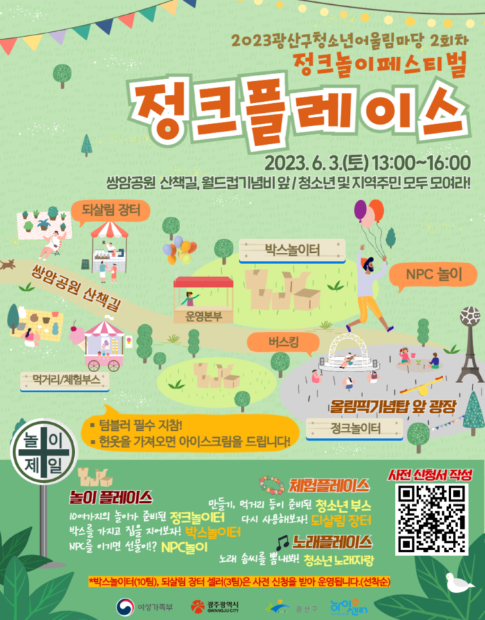 [광주=프레스뉴스] 강래성 기자= 광산구청소년수련관(이운기 관장)은 돌아오는 2023년 6월 3일 첨단 쌍암공원 산책길 및 올림픽기념비 앞 광장에서 2023광산구청소년어울림마당 2회차 정크 놀이 축제 ‘정크플레이스’ 개최한다고 밝혔다.