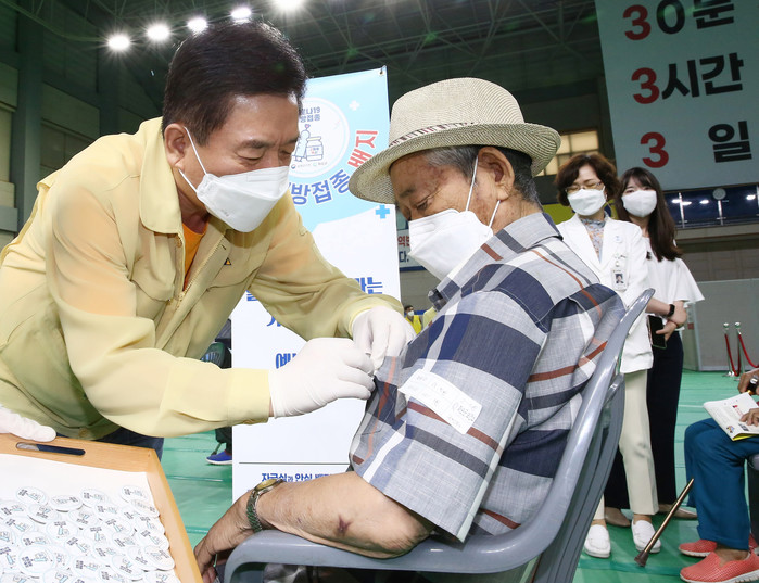 | ▲ 지난 13일 구충곤(사진 왼쪽) 화순군수가 화순군 코로나19 예방접종센터를 찾아 백신 접종을 마친 65세 이상 어르신들에게 ‘백신 접종 배지’를 달아주고 있는 모습.(사진제공=화순군) |