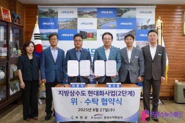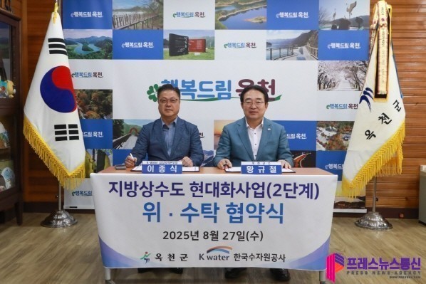 [프레스뉴스] 류현주 기자= 옥천군이 지난 27일 군청 군수실에서 한국수자원공사 금강유역본부(본부장 이종식)와 함께 ‘지방상수도 현대화사업(2단계) 위수탁 협약’을 체결했다.