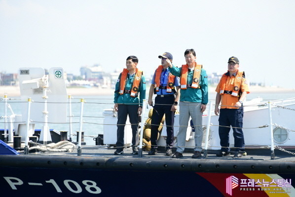 ▲이민근 안산시장(오른쪽 두번째)이 지난해 8월 7일 평택해경 경비정에 탑승해 대부도 해상을 순찰하고 있다.(사진=안산시) |