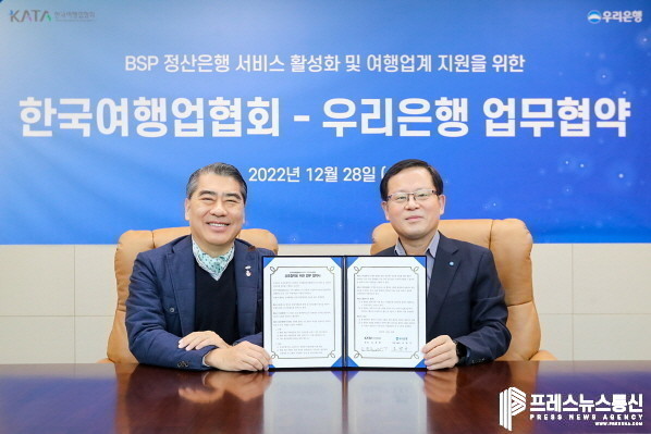 [프레스뉴스] 김대일 기자= 우리은행(은행장 이원덕)은 지난 28일 우리은행 본점에서 한국여행업협회(KATA)와 여행업계 지원을 위한 업무협약을 체결했다고 29일 밝혔다. 이날 협약식에는 우리은행 기업그룹 조병규 부행장과 KATA 오창희 회장을 비롯한 관계자들이 참석했다.