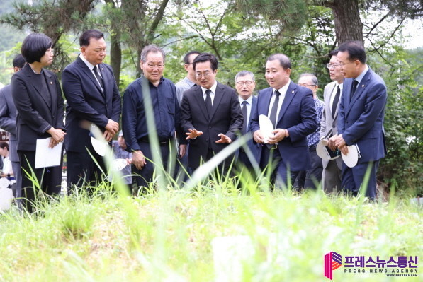 | ▲8일 오전 선감학원 공동묘역에서 열린 선감학원 희생자 유해발굴 개토 행사에서 김동연 경기도지사가 개토 행사를 마치고 선감학원 희생자 분묘를 살펴보고 있다.(사진=경기도) |