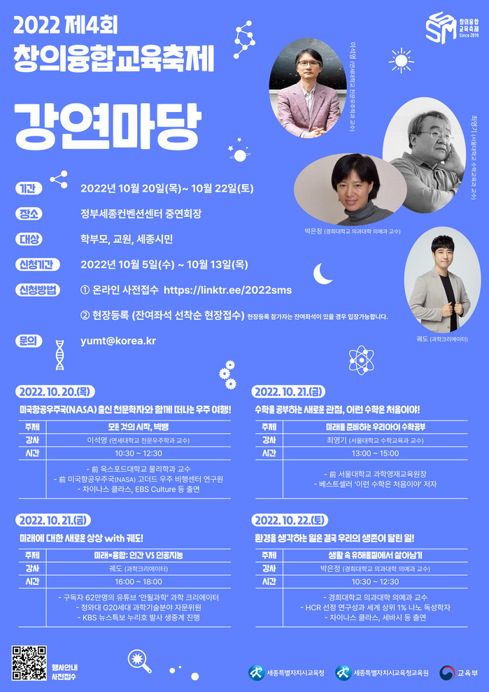신청은 오는 13일까지 창의융합교육축제 안내 링크를 통해 온라인 사전접수가 가능하며, 강연 당일 잔여 좌석에 한해 선착순으로 현장등록도 가능하다.