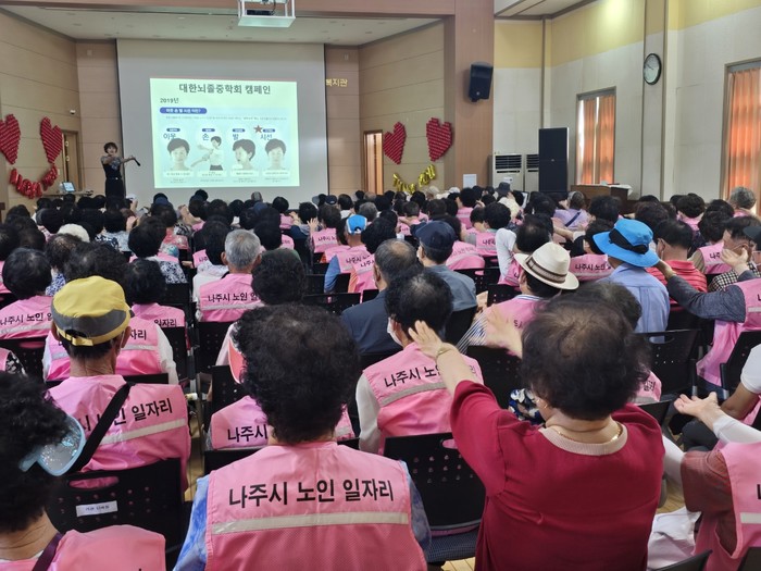 나주시노인복지관 이용자 등 400여 명을 대상으로 한 이번 강좌는 심근경색증의 특징, 초기증상(극심한 가슴통증 등)과 뇌졸중의 종류, 초기증상(얼굴·팔 마비, 언어장애 등), 질환별 치료방법, 골든타임의 중요성, 응급처치 방법 등을 교육했다.