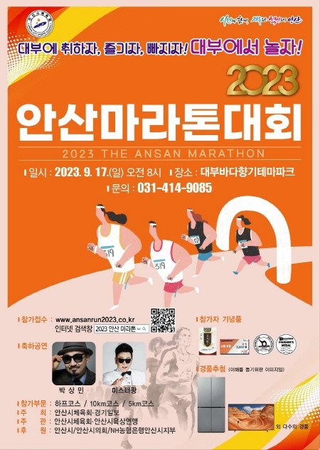 [프레스뉴스] 장현준 기자= 안산시(시장 이민근)는 시민들의 건강한 여가활동 및 생활체육 활성화를 위해 ‘2023 안산마라톤대회’를 오는 9월 17일 대부바다향기테마파크 일원에서 개최한다고 7일 밝혔다.