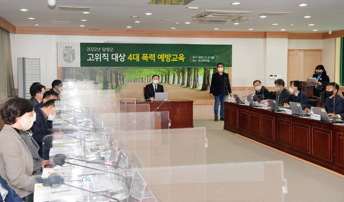 [전남=프레스뉴스] 박정철 기자= 담양군(군수 이병노)은 지난 21일 고위직 공무원을 대상으로 4대 폭력(성희롱·성폭력·성매매·가정폭력) 예방 교육을 실시했다.