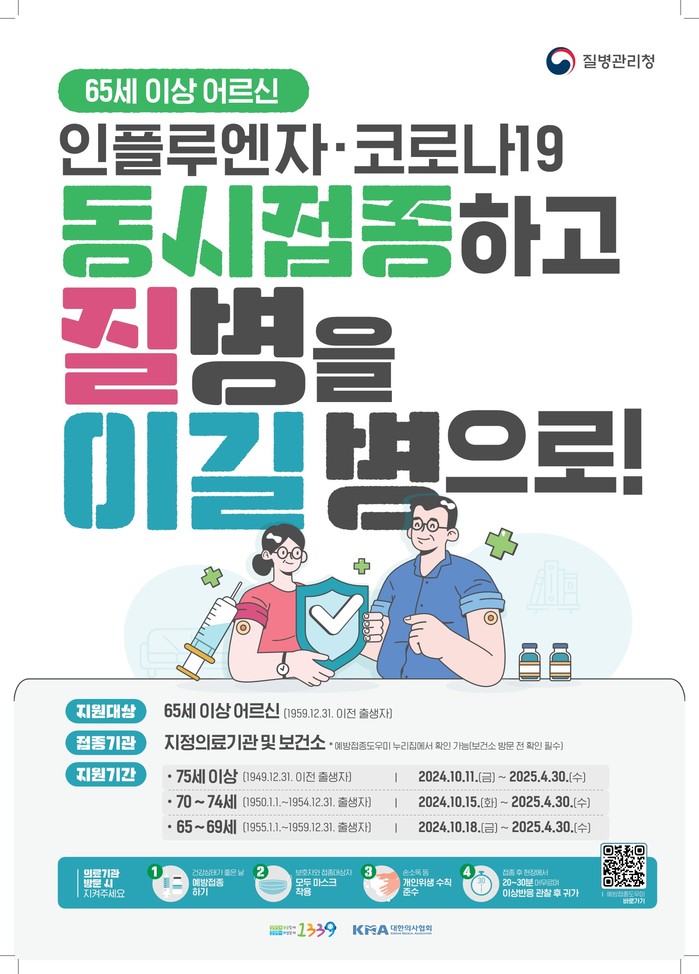 보건소, 보건지소·진료소에서는 10월 18일부터 접종이 가능하다. 덧붙여, 이번 ‘2024∼2025’ 절기 코로나19 예방접종은 인플루엔자와 동시접종이 가능하며 65세 이상인 경우 무료접종이 가능하다.