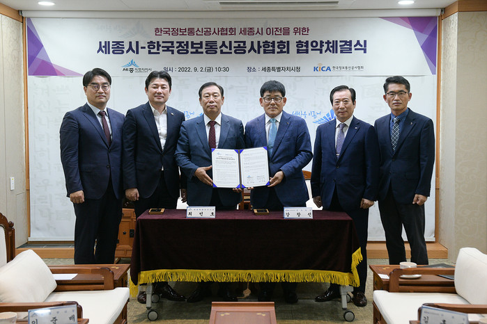 세종시가 2일 세종시청 접견실에서 최민호 시장과 강창선 한국정보통신공사협회 중앙회장이 참석한 가운데 ‘한국정보통신공사협회 세종시 이전 업무협약’을 체결했다고 밝혔다.