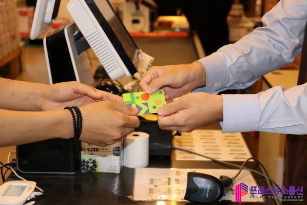 | ▲관내 한 마트에서 향수OK 카드로 결제하고 있다.(사진=옥천군) |