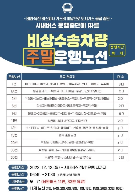 [전남=프레스뉴스] 이광남 기자= 전남 목포시가 태원·유진 시내버스회사의 가스비 미납에 따른 도시가스 공급 중단으로 운행하고 있는 비상수송차량의 주말·휴일 운행시간이 아침 6시40부터 저녁 9시30분까지로 확대된다.