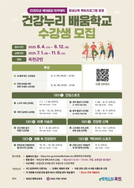 [프레스뉴스] 류현주 기자= 옥천군이 통합 건강 프로그램 ‘건강누리 배움학교’에 참여할 수강생을 오는 6월 4일부터 6월 12일까지 모집한다.
