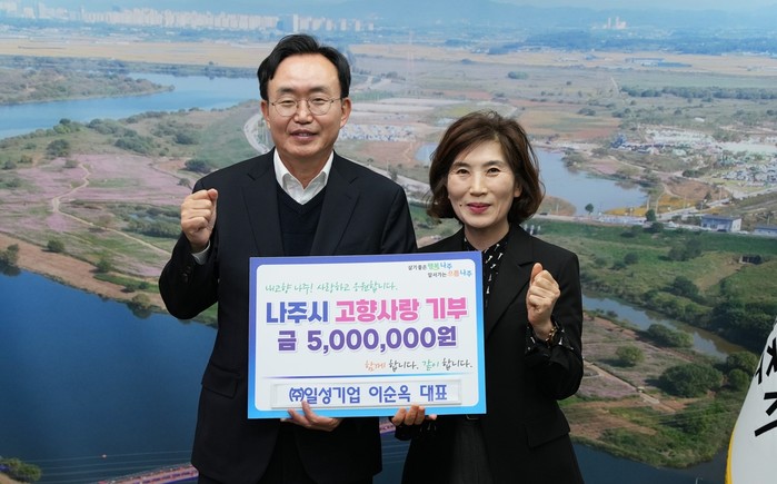 윤병태 나주시장은 “3년 연속 고향사랑기부제에 동참해 나눔의 뜻을 실천하는 이순옥 대표께 깊이 감사드린다”며 “기탁해 주신 기부금은 시민 복리 증진과 나주의 발전을 위해 적극 활용하겠다”고 말했다.