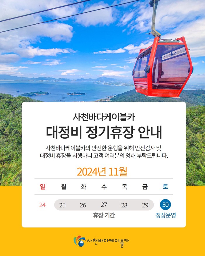 | ▲사천시시설관리공단(이사장 한재천)은 사천바다케이블카 하반기 전기설비 안전검사 및 대정비를 위해 오는 25일부터 29일까지 5일간 임시휴장한다. (사진=사천시) |