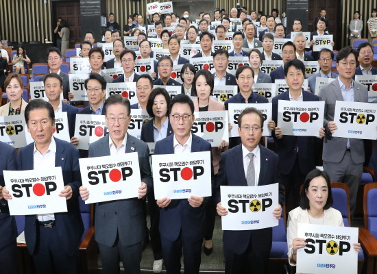 ▲이재명 더불어민주당 대표와 박광온 원내대표를 비롯한 의원들이 24일 오전 국회에서 열린 긴급 의원총회에서 '후쿠시마 핵오염수 해양투기 STOP'이 적힌 피켓을 들고 구호를 외치고 있다. (사진= 뉴스1) |