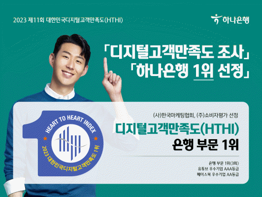 [프레스뉴스] 김대일 기자= 하나은행(은행장 이승열)은 (사)한국마케팅협회와 ㈜소비자평가가 주관하는 ‘2023 제11회 대한민국디지털고객만족도(Heart to Heart Index, 이하 HTHI)’ 조사에서 「은행 부문 1위」로 선정됐다고 밝혔다.