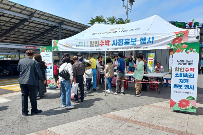 현장에서는 시원하고 당도 높은 함안수박을 직접 맛볼 수 있으며, 축제 정보와 홍보물도 함께 제공된다.