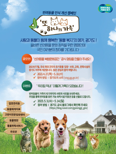 한편, 경기도는 경기도 반려동물 복합문화공간 개관을 앞두고 4월 27일부터 6월 4일까지 ‘또 하나의 가족’이라는 이름의 반려동물 인식 개선 캠페인을 진행할 예정이다. 4월 27일은 동물보호법 전부개정법률안 시행일이다. 캠페인 기간 도는, 경기도 반려동물 복합문화공간 명칭 공모 참여를 독려하는 누리소통망(SNS) 캠페인을 병행할 예정이다.