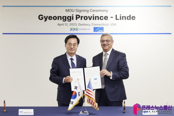 김동연 경기도지사는 미국 현지 시각 12일 오후 코네티컷 댄버리 린데(Linde) 본사에서 산지브 람바(Sanjiv Lamba) 그룹 회장, 성백석 코리아 회장과 ‘수소차 충전용 수소 및 산업용 가스 생산’ 투자협약을 체결했다. 행사에는 남경순 경기도의회 부의장, 유대종 국제관계대사도 함께 했다.