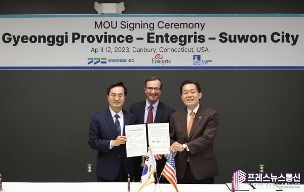 김동연 지사는 미국 시각 12일 오후 코네티컷 댄버리 인테그리스사(Entegris) 기술센터에서 제임스 A. 오닐(Jim O'Neill) 인테그리스사 수석부회장, 이재준 수원시장과 이런 내용을 담은 ‘반도체 소재 연구소 투자협약’을 체결했다.
