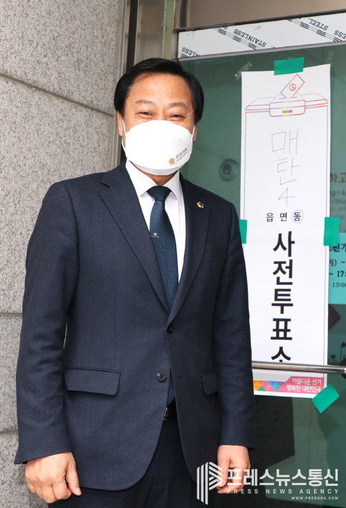 ▲ 경기도의회 장현국 의장이 4일 오전 수원시 매탄4동 행정복지센터에서 사전투표 기념 촬영을 하고 있다.(사진=경기도의회) |
