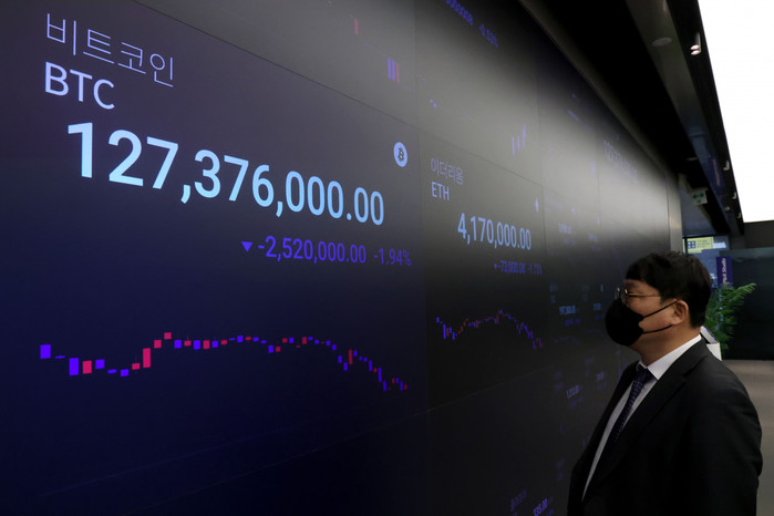 | ▲21일 서울 강남구 업비트 고객센터 전광판에 비트코인 거래 가격이 표시됐다./사진=뉴스1 |