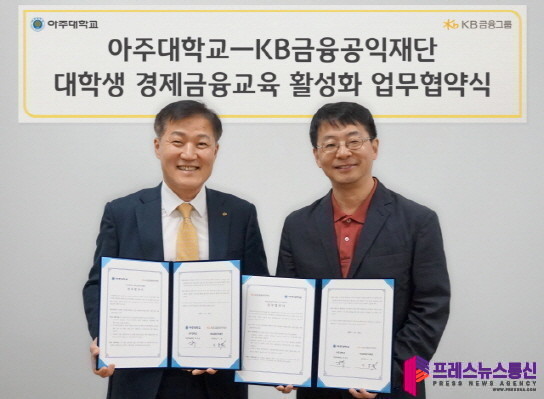 [프레스뉴스] 류현주 기자= KB금융공익재단(이사장 양종희, 이하 KB재단)은 2일 아주대학교(총장 최기주, 이하 아주대)와 함께 대학생들의 올바른 금융·경제활동과 진로탐색을 위한 교육 및 콘텐츠 지원 협력을 위한 업무협약(MOU)을 체결했다.