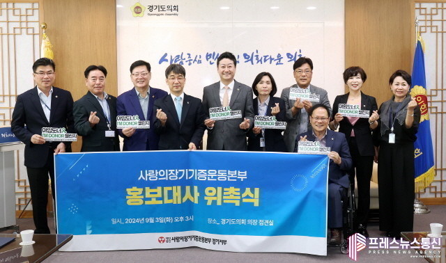 [프레스뉴스] 류현주 기자= 장기기증의 날(9월 9일)을 앞둔 3일, 경기도의회 의장 접견실에서 ‘경기도의회 생명나눔서약식 및 홍보대사 위촉식’이 진행됐다.