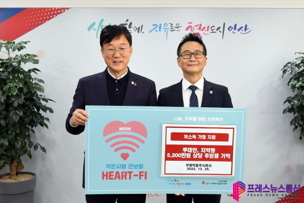 [프레스뉴스] 장현준 기자= 안산시(시장 이민근)는 지난 26일 부광약품주식회사(대표 유희원)로부터 루테인, 크릴오일, 치약 등 5천200만 원 상당의 후원품을 기탁받았다고 27일 밝혔다.