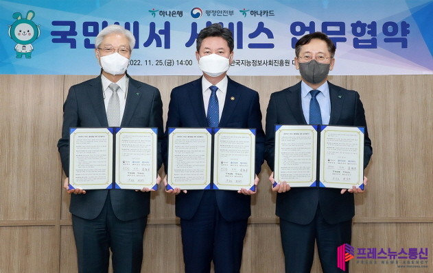 [프레스뉴스] 김대일 기자= 하나은행(은행장 박성호)은 지난25일 오후 서울 중구 한국지능정보사회진흥원 서울사무소에서 행정안전부와 「국민비서 서비스 제공 및 활성화」를 위한 업무협약(MOU)을 체결했다고 밝혔다.