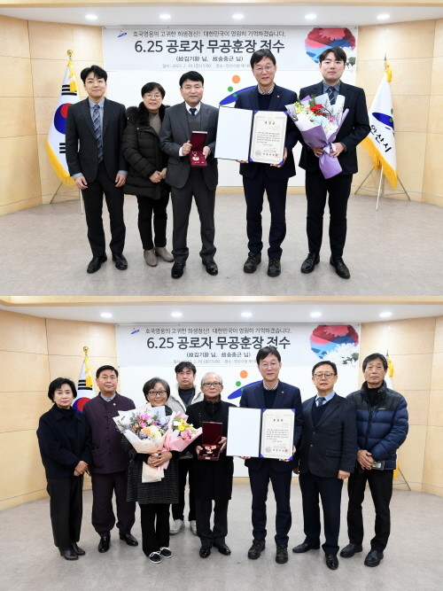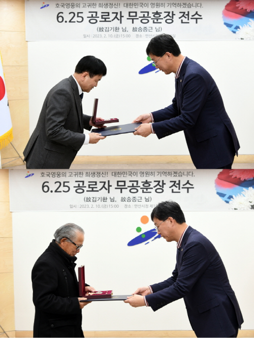 [프레스뉴스] 장현준 기자= 안산시(시장 이민근)는 6·25 참전유공자인 고(故) 김기환 상사와 고(故) 송종근 일병에게 각각 충무무공훈장과 화랑무공훈장을 전수했다고 12일 밝혔다.