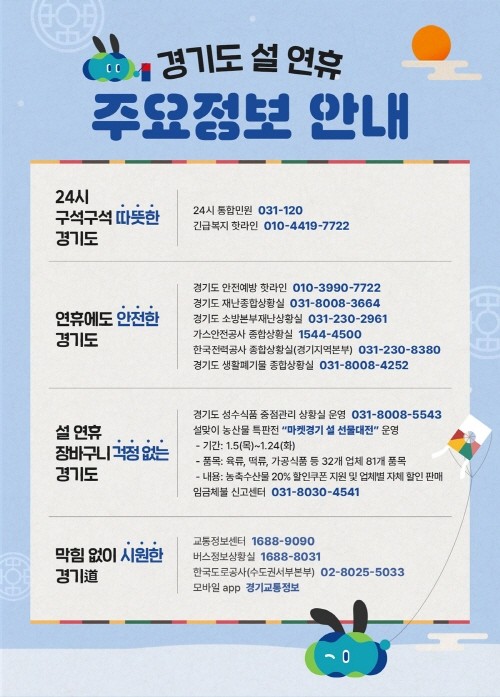 도는 21일부터 24일까지 ‘설 연휴 종합상황실’을 운영해 종합안내와 도민 불편 사항에 즉각적으로 대응할 계획이다. 연휴기간 발생하는 각종 불편 사항은 ‘120 경기도콜센터’로 신고할 수 있다. 센터는 각종 불편 사항 접수는 물론 교통정보 및 응급의료기관 등을 안내한다. 안전예방핫라인과 긴급복지핫라인도 상시 가동한다.