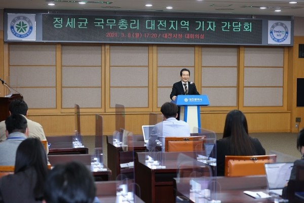 정세균 국무총리가 8일 대전 보라매공원에서 열린 ‘3·8 민주의거 기념식’에 참석한 후, 대전지역 언론인들과의 간담회 자리에서 이 같이 밝혔다.
