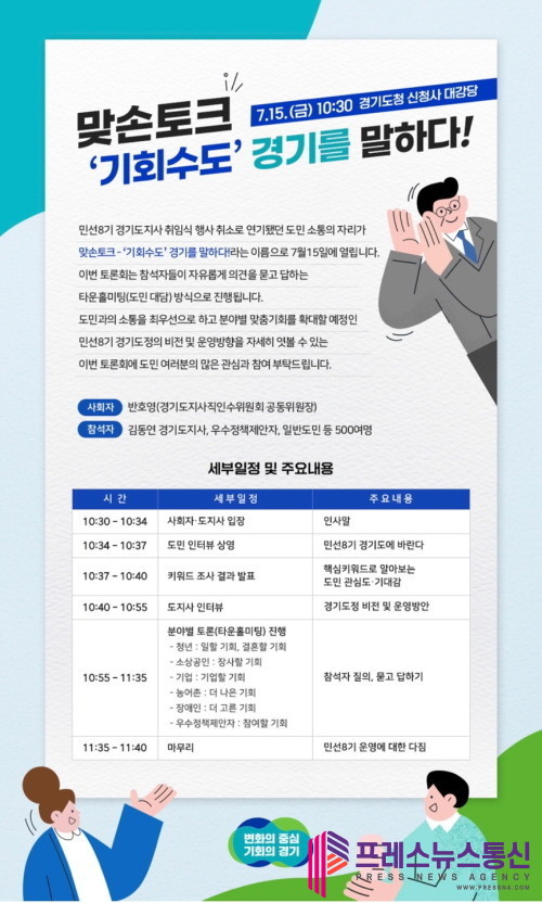[프레스뉴스] 장현준 기자= 김동연 경기도지사가 경기지역 호우 피해로 연기했던 도민 소통행사를 ‘맞손토크-기회수도 경기를 말하다’라는 이름으로 15일 개최한다.