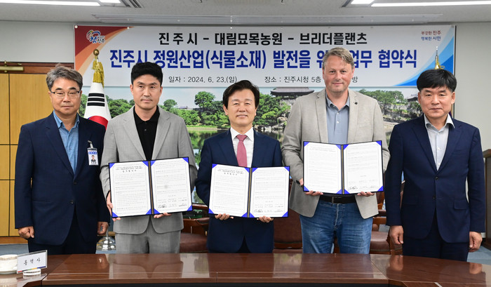 [프레스뉴스] 정호일 기자= 진주시는 23일 시청 5층 기업인의 방에서 충북 옥천군 소재 대림묘목농원 JB가든, 네덜란드의 브리더플랜츠(Breederplants)와 정원산업 발전을 위한 업무협약을 체결했다.