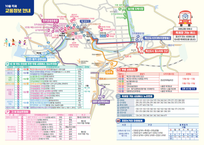 진주시 관계자는 “관외 방문객은 임시주차장에 주차한 뒤 셔틀버스를, 시민은 청소년 100원 요금제와 경남패스 혜택이 적용되는 시내버스를 이용하면 더 편리하다”며 “축제장 주변 교통환경을 안전하고 쾌적하게 조성해 모두가 즐길 수 있는 축제가 되도록 최선을 다하겠다”고 말했다.
