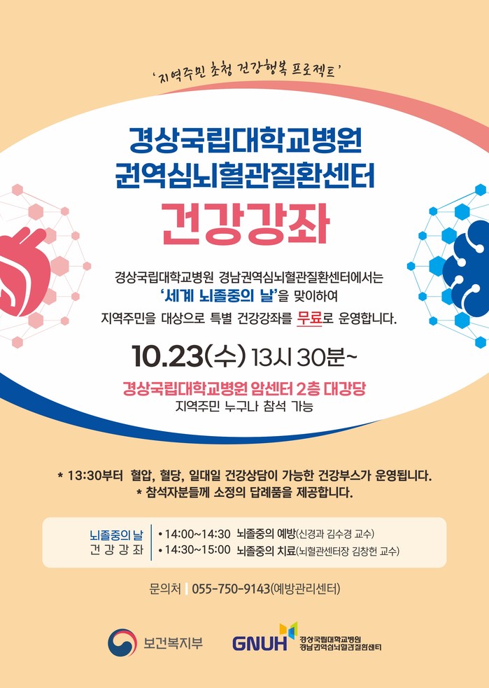 | ▲경상국립대학교병원(병원장 안성기) 권역심뇌혈관질환센터(센터장 고진신)가 ‘세계 뇌졸중의 날’을 맞아 뇌혈관계 질환 관련 경각심 제고 및 인식 개선을 위해, 오는 23일(수) 오후 2시부터 경남지역암센터 2층 대강당에서 건강강좌를 진행한다 (사진=경상국립대병원) |