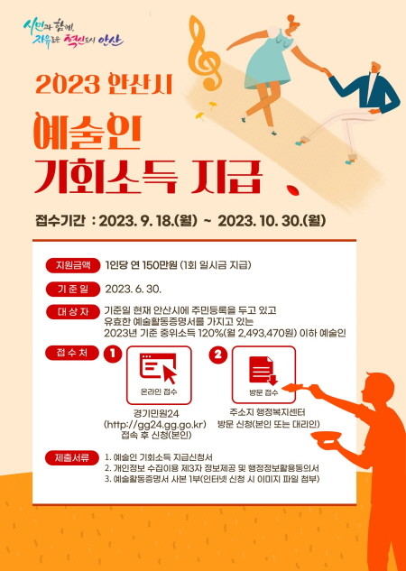 | ▲ 2023 안산시 예술인 기회소득 지급 안내 포스터(사진=안산시) |