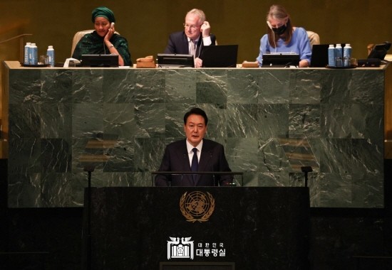 ▲윤 대통령이 지난해 9월 20일(현지시간) 미국 뉴욕에서 열린 제77차 유엔 총회에서 기조연설을 하고 있다. (사진= 대통령실) |