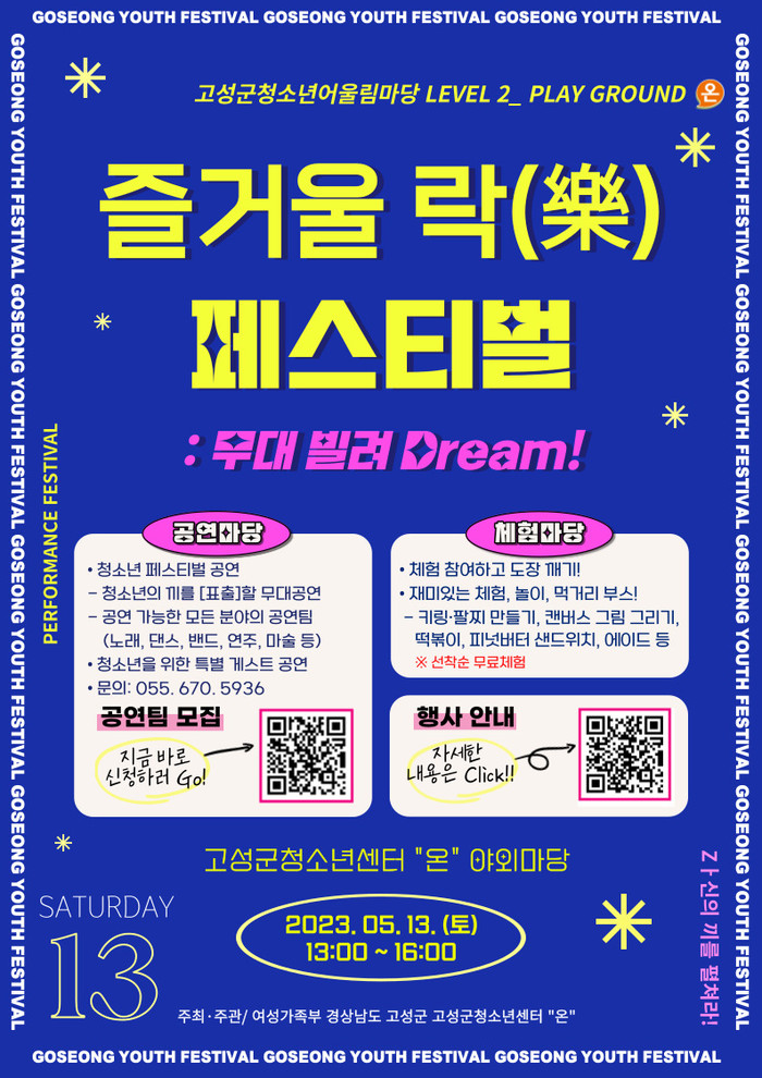 이번 고성군청소년어울림마당은 청소년의 음악적 끼와 재능을 펼칠 수 있도록 5월 13일 오후 1시부터 4시까지 고성군청소년센터 “온” 야외마당에서 열린다.
