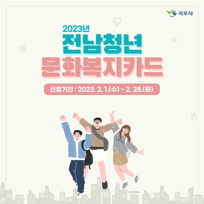 [전남=프레스뉴스] 이광남 기자= 전남 목포시가 오는 2월 1일부터 28일까지 청년들을 대상으로 전남청년 문화복지카드 지원대상자를 모집한다.