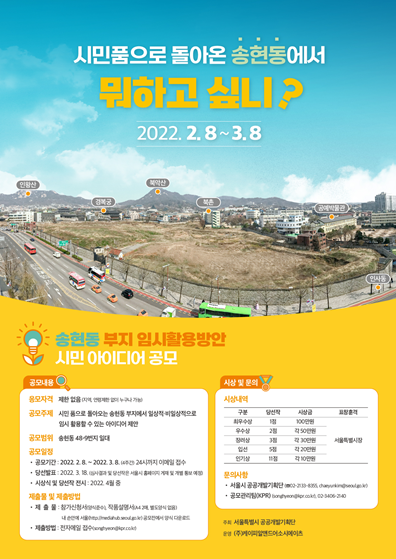 [프레스뉴스] 장현준 기자= 서울시는 지난해 서울시-대한항공-LH간 3자 매매/교환 방식으로 계약 체결한 매입한 송현동 부지를 임시 개방하여 시민들이 일상의 휴식과 다양한 문화예술 경험을 동시에 즐길 수 있는 공간으로 활용하고자 ’22년 2월 8일부터 3월 8일까지 ‘송현동 부지 임시활용방안 시민 아이디어 공모전’을 개최한다.