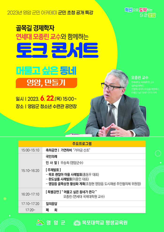 [전남=프레스뉴스] 강래성 기자= 전남 영암군(군수 우승희)이 이달 22일 영암군청소년수련관으로 ‘골목길 경제학자’로 이름 높은 모종린 교수를 초청해 ‘영암군민 아카데미’를 연다.