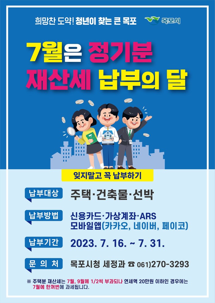 시 관계자는 재산세는 우리 시민들의 복지 증진을 위해 사용되는 자주재원이므로 7월 31일까지 납부기간 내 납부해 줄 것을 당부했다.