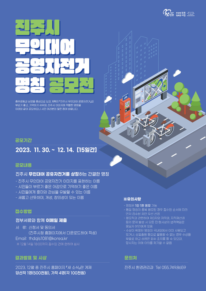 [프레스뉴스] 정호일 기자= 진주시는 무인대여 공영자전거 도입 시행에 따라 30일부터 12월 14일까지 ‘무인대여 공영자전거 명칭 공모전’을 실시한다.